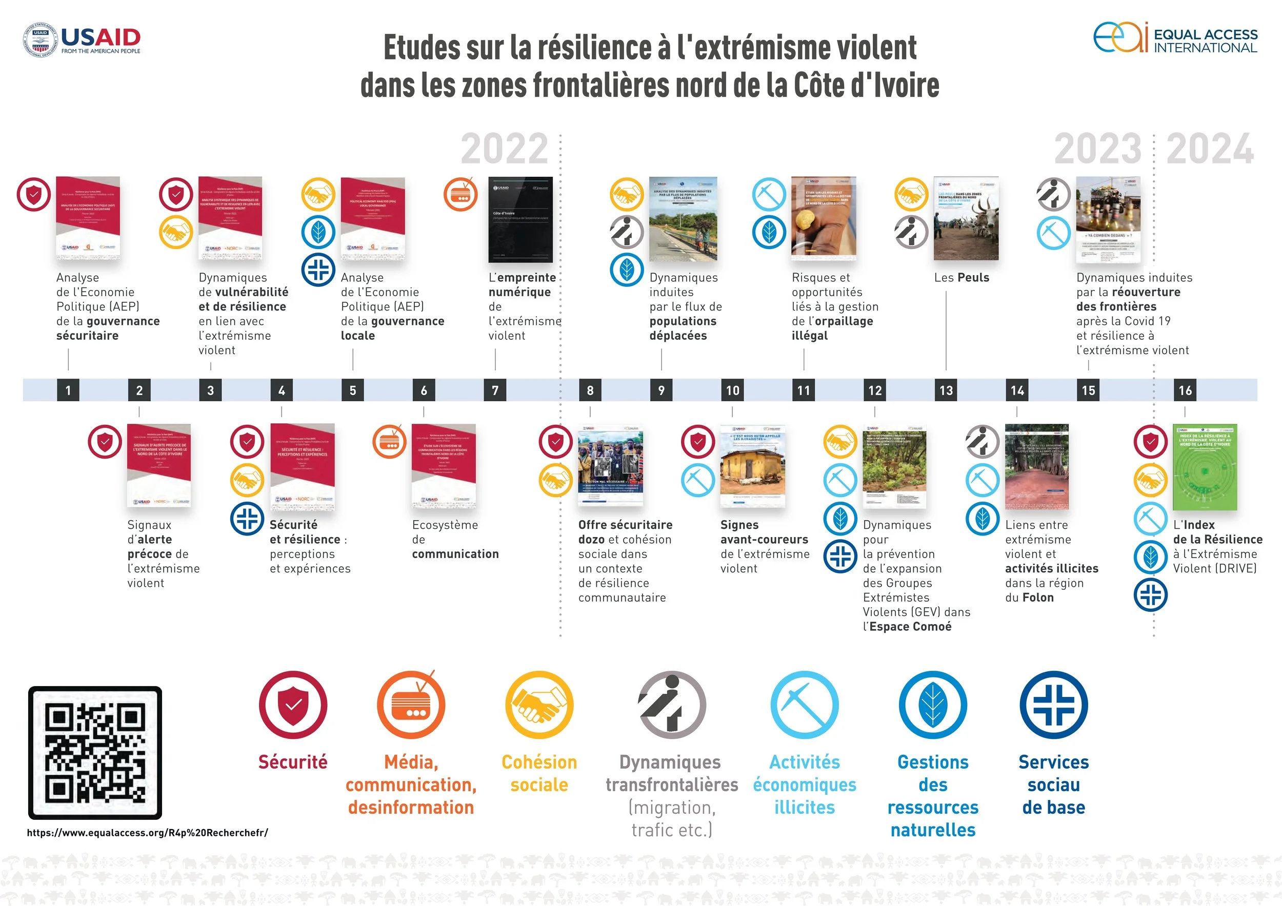 Ce rapport présente les résultats de l’étude Comprendre la communauté peule, avec une perspective de genre et de jeunesse, dans les zones frontalières du nord de la Côte d’Ivoire (Understanding the Fulani community, with a gender and youth perspective, in the northern border areas of Côte d’Ivoire). Cette étude a été commanditée par Equal Access International (EAI), avec un financement de l’USAID, pour documenter les dynamiques à l’œuvre là où elle met en œuvre son projet Résilience pour la paix (R4P), depuis que la région est sous la menace des Organisations Extrémistes Violentes (OVE) . Les attentats de Grand-Bassam du 13 mars 2016, qui ont coûté la vie à seize personnes, ont représenté un déplacement dynamique de l’activité djihadiste du Sahel (Cline, 2023) vers les pays du Golfe de Guinée. En l’espace de 18 mois, de juin 2020 à mars 2022, les Forces armées de Côte d’Ivoire (FACI) à Kafolo, Tougbo et Tehini, localités situées à la frontière avec le Burkina Faso, ont été la cible de plusieurs attaques terroristes, tuant seize soldats. Depuis, les FACI ont installé un grand camp à l’entrée de la ville de Tehini. Récemment, leur mode opératoire ayant évolué, les OEV ont eu recours à des engins explosifs improvisés (EEI) pour piéger certains itinéraires et ralentir la sécurisation de la zone. Il en est résulté une psychose dans la région, alimentée par des fausses nouvelles et des rumeurs, qui a affecté la tranquillité d’esprit de la population locale et entravé les activités socio-économiques. La perception du risque a entraîné d’importants déplacements de populations dans certaines localités du Tchologo et du Bounkani, et a cristallisé les suspicions entre communautés.